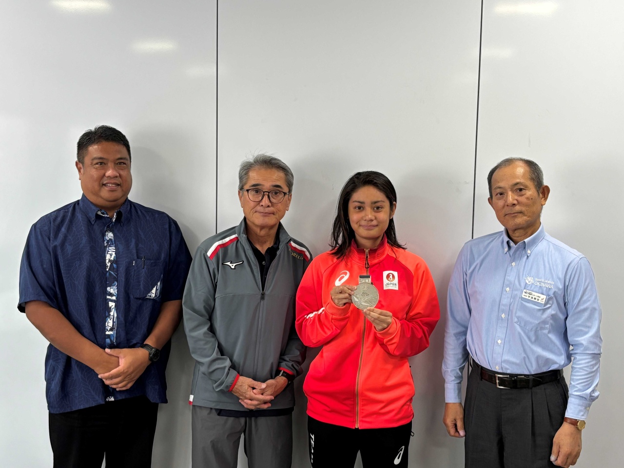 令和7年12月3日(水)、女子デフサッカー日本代表 宮城 実来 選手が県スポーツ協会を訪れ、平良専務理事に「第25回夏季デフリンピック競技大会 東京2025」の大会報告を行いました。