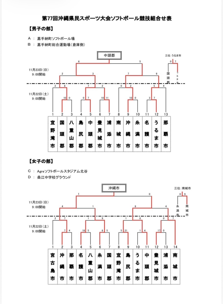 | ソフトボール | 11/22・23 | Agreソフトボールスタジアム北谷・桑江中学校 嘉手納町ソフトボール場・嘉手納町総合運動場 |